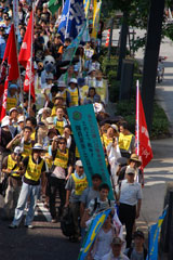 8月6日、広島で、全国連は反戦・反核闘争にたちあがりました。小泉政権による憲法改悪阻止、またミサイル発射を口実にした北朝鮮への経済制裁や、「やられる前に敵地をたたけ」などという侵略戦争を絶対に許さない決意をこめて全国連は決起しました。