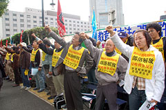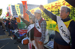 | 国会にむけシュプレヒコール(15日、中田書記長先頭に) |