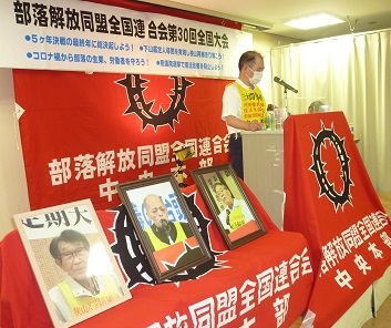 部落解放同盟全国連合会第30回全国大会を7月25日、大阪・大東市立市民会館で行いました。コロナ禍での様々な制約があるなか、必要な対策をとり全国からの代表参加と一部リモートでの参加のもと2年ぶりに大会を成功させました。