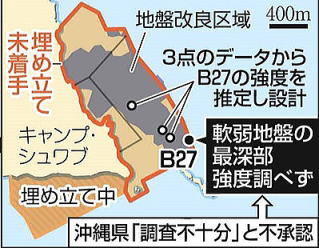 90mに達する軟弱地盤の改良工事は世界でも例がない。「B27」地点には巨大な護岸が建つ。強度が足りなければ護岸が崩壊する恐れもあり、国会では何度も「B27」地点の再調査を求めたが政府は拒否した。
