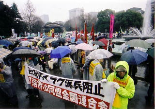 全国連は1月いらい小牧、北海道・旭川、呉で自衛隊の出兵阻止の現地闘争をたたかいぬき、そして第13回全国大会での「3・20日比谷公園に総結集」の決議をあげ、全国動員で東京・日比谷公園のたたかいに合流しました。