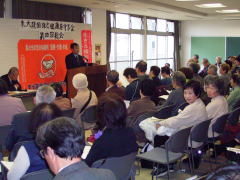 阪口克己・国健会事務局長は「「小泉の改憲と民営化で、基本的人権や社会保障がうばわれている。ゼネストをやれるような大きな力をつけて反対していこう」と訴えました。 これをうけて、市内の8地区の国健会支部の代表が組織拡大とたたかいの決意を語りました。